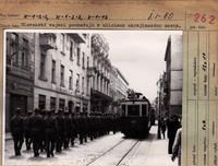 Ťaženie proti ZSSR - Slovenskí vojaci pochodujú v uliciach ukrajinského mesta. Júl 1941.