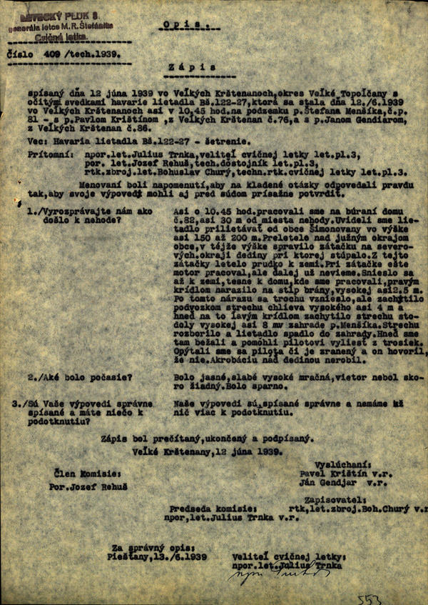 Havária lietadla Bš 122.27 s motorom W. Castor II. 114 - adm. prejednanie. (103597)