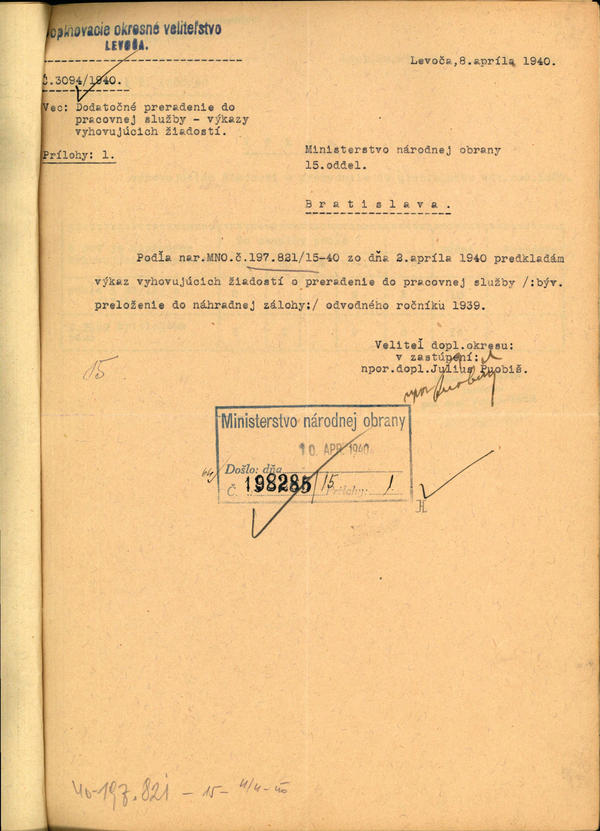 Branci voj. služby odv. roč. 1939 - dodatočné preradenie do pracovnej služby. (198439)