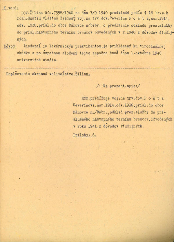 Pošta Severín, voj. na trv. dov. p. pl. 5, 1914/1936 - predĺženie odhadu prez. služby. (212985)