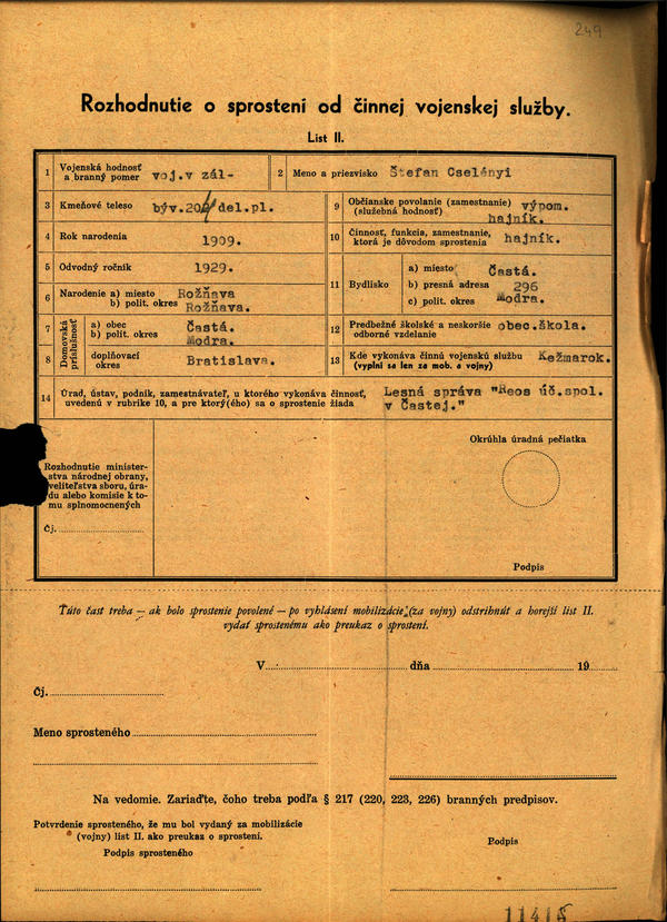 Les. správa ,, Reos´´ Častá - zoznam. Vyčkávacie osvedčenia a rozhodnutia o sprostení od činnej voj. služby. (207072)