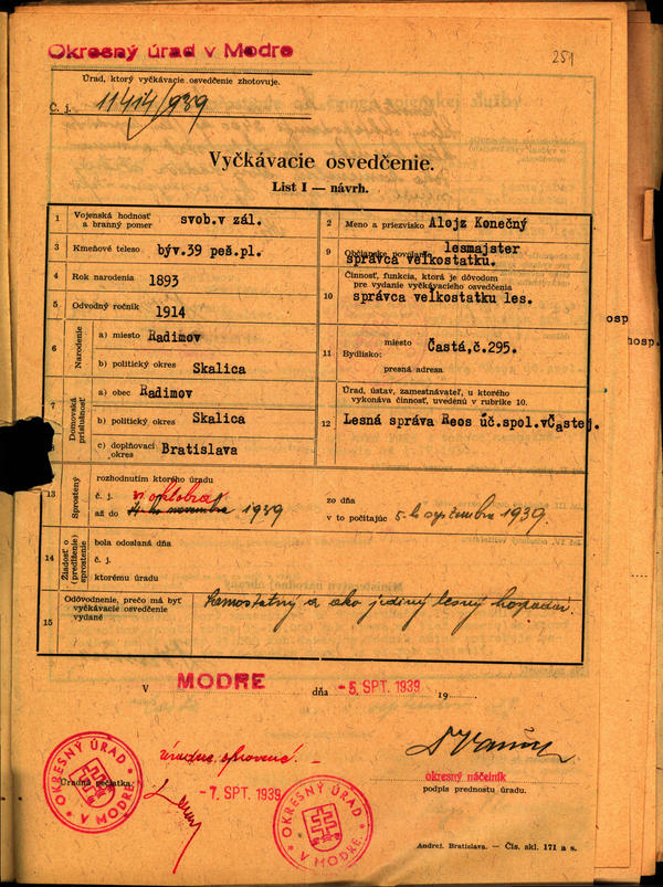 Les. správa ,, Reos´´ Častá - zoznam. Vyčkávacie osvedčenia a rozhodnutia o sprostení od činnej voj. služby. (207072)