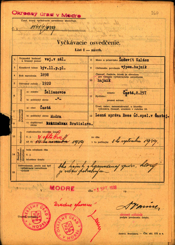 Les. správa ,, Reos´´ Častá - zoznam. Vyčkávacie osvedčenia a rozhodnutia o sprostení od činnej voj. služby. (207072)