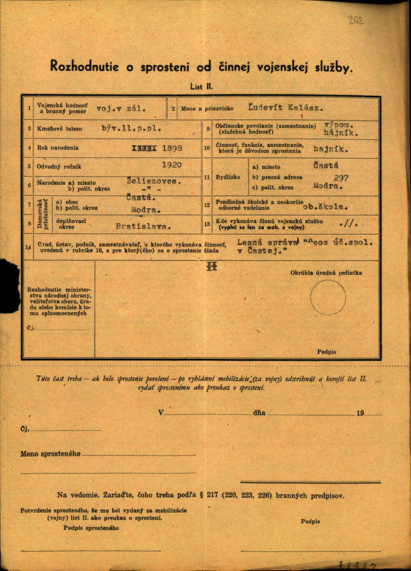 Les. správa ,, Reos´´ Častá - zoznam. Vyčkávacie osvedčenia a rozhodnutia o sprostení od činnej voj. služby. (207072)