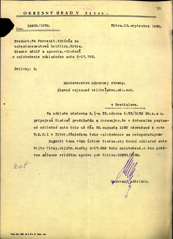 Firma FERRENIT, továreň na azbestocementovú bridlicu v Nitre A. Kramer a synovia - žiadosť o oslobodenie mot. vozidiel. (207861)