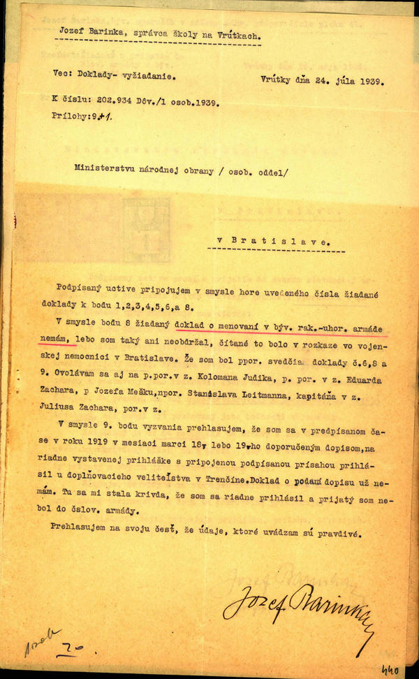 Barinka Jozef, voj. v zál. ppl. 41 - žiadosť o priznanie hodnosti ppor. pech. v zál. (202934)