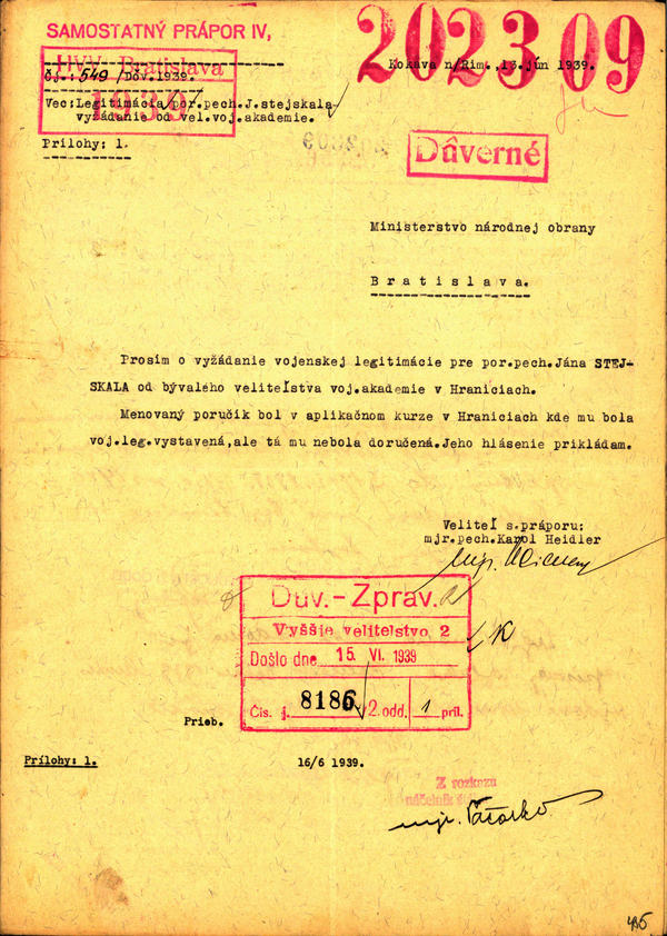 Legitimácia por.pech. Jána Stejskala - vyžiadanie od veliteľstva voj. akadémie. (202309)