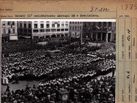 Oslavy 2. celoštátneho nástupu Hlinkovej mládeže v Bratislave. Na obr. slávnostná akadémia pred Národným divadlom. Na tribúne prezident Dr. J. Tiso (v strede) a hlavný veliteľ HM Alojz Macek (vpravo).