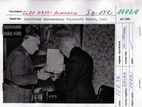 Chorvátsky vyslanec na Slovensku Dr. Josip Berkovič /vľavo/ odovzdáva predsedovi vlády JUDr. Vojtechovi Tukovi /vpravo/ Vel'kokríž radu koruny kráľa Zvonimíra. Bratislava, október 1942.