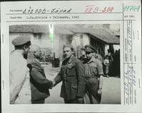 Veliteľ 1. čs. divízie v Taliansku pplk. Jaroslav Kmicikievič /druhý zľava/ víta príslušníkov divízie, ktorí bojovali v radoch talianskych partizánov.