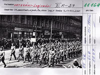 Legionári vynášajú historické zástavy svojich plukov z budovy Vojenského historického ústavu v Prahe 6. júla 1947.