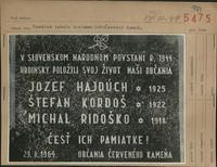 ČERVENÝ KAMEŇ, okr. Považská Bystrica. Pamätná tabuľa hrdinom SNP na budove MNV, odhalená v r. 1964.