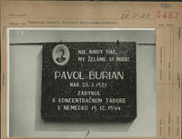 KVÁŠOV, okr. Považská Bystrica. Pamätná tabuľa Pavlovi Burianovi na budove MNV, autorom je Kamenársky podnik Trenčín, odhalená v r. 1969.