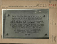 DOLNÝ KUBÍN. Pamätná tabuľa Hrdinke SNP "IN MEMORIAM" Alžbete Csillaghyovej, ktorá padla v SNP, na Gymnáziu P.O. Hviezdoslava, odhalená z príležitosti 20. výročia SNP.