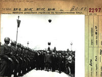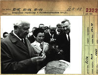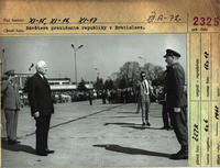 Návšteva prezidenta republiky Ludvíka Svobodu vo Východoslovenskom kraji. Na obrázku prezident republiky so svojím sprievodom pri prehliadke cestnej vojenskej jednotky pri pamätníku padlých sovietskych hrdinov vo Svidníku.
