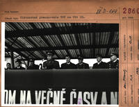 Slávnostné premenovanie VPF na VPA KG – Vojenskú politickú akadémiu Klementa Gottwalda v Bratislave. Na obrázku prehliadka nastúpených jednotiek s historickými zástavami Španielskych interbrigadistov a 1. čs. armádneho zboru. Prehliadku vykonal gen.mjr. Reindl (1. zľava) - veliteľ VPA KG, minister národnej obrany gen.plk. M. Dzúr (2. zľava) a predseda slovenskej vlády prof. Peter Colotka (3.zľava).