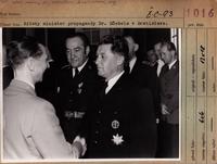Príchod ríšskeho ministra propagandy Dr. J. Göebelsa do Bratislavy. Na obr. privítanie ministrom vnútra a hlavným veliteľom HG Š. Machom (vpravo)..T. J. Gašpar, ved. ÚP v strede.