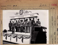 Pohľad na prvých príslušníkov pluku, ktorí stojí na alegorickom voze.