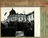 Manifestačné zhromaždenie protifašistických väzňov. Za Zväz partizánov prehovoril Pavol Mesjarik.