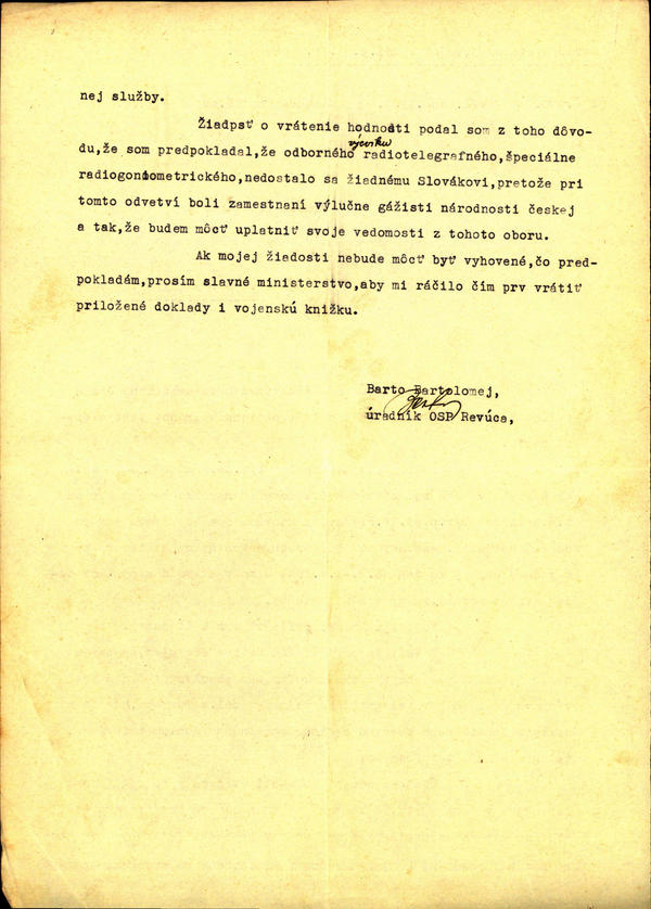 Barto Bartolomej, strel. v zál. - žiadosť o priznanie dôst. hodnosti. (213207)