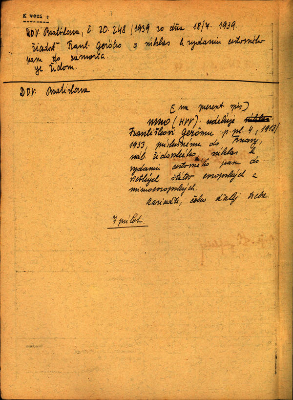 Gerö František, voj. na trv. dovolenke p. pl. 4 - súhlas k vydaniu cestovného pasu. (105214)