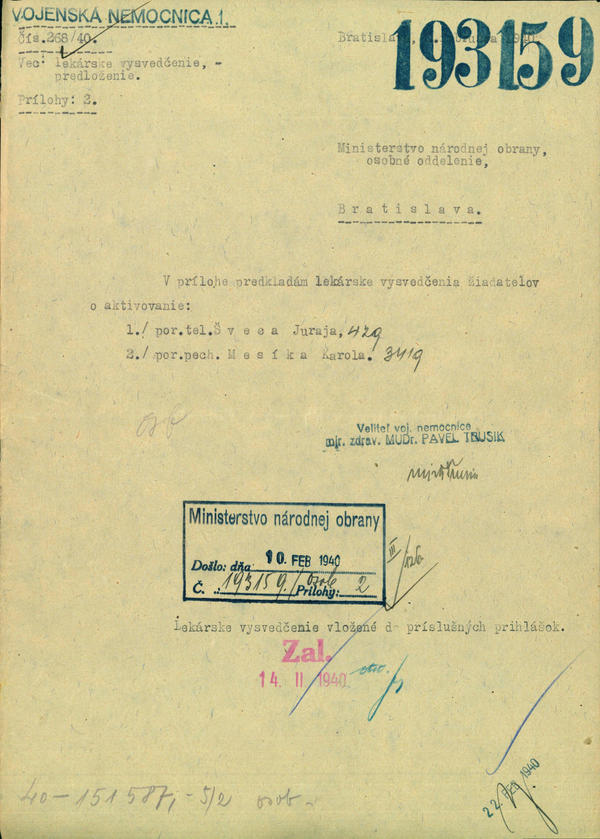 Lekárske vysvedčenie (por. tel. Švec Juraj, por. pech. Mesík Karol) - predloženie. (193159)