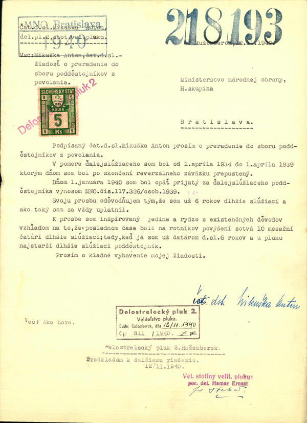 Mikuška Anton, čat. ďsl. - žiadosť o preradenie do zbou poddôstojníkov z povolania. (218193)
