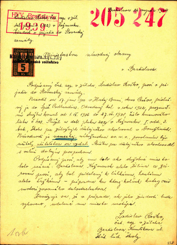 Žiadosť o prijatie do slovenskej armády. (205247)