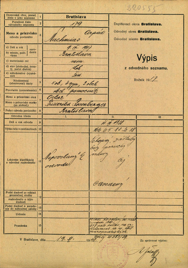 Nachmias Arpád, žid. pracovník mimo činnej povinnosti - odklad prac. povinnosti. (220555)