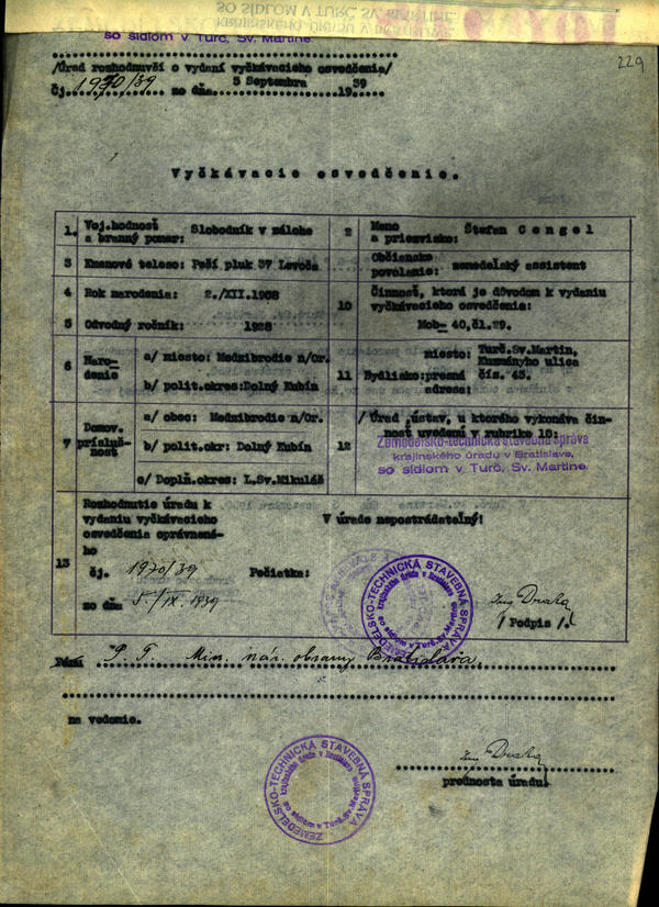 Štefan Cengel, zemedelský asistent, vyčkávacie osvedčenie. (207061)