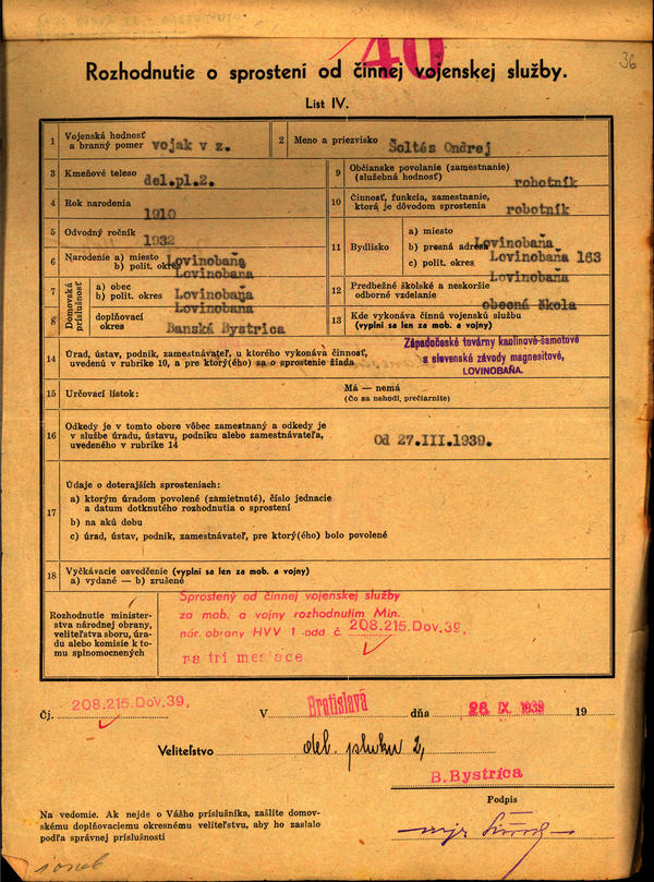 Listy IV - vyžiadanie. Rozhodnutie o sprostení od činnej voj. služby - Šoltés Ondrej. (208215)