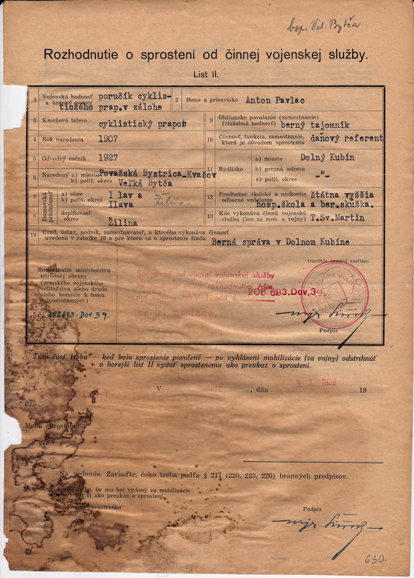 Sprostenie od činnej služby za mobilizácie a vo vojne. (208693)