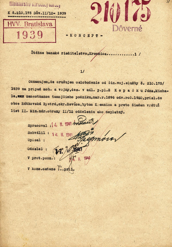 Koncept - zrušenie oslobodenia od čin. voj. služby (des. v zál. Kopačka Ján, Michal). (210175)